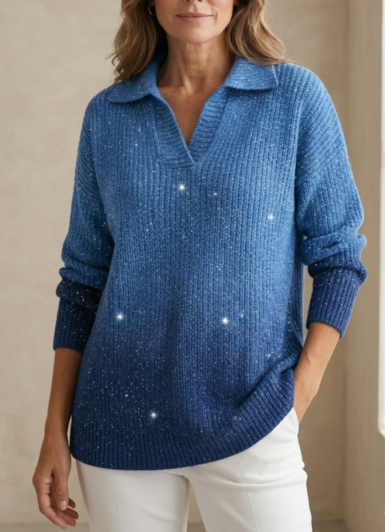 Un léger effet lumineux très discret donne au pull une touche élégante, sans brillance excessive — idéal pour celles qui préfèrent un style sobre et intemporel.